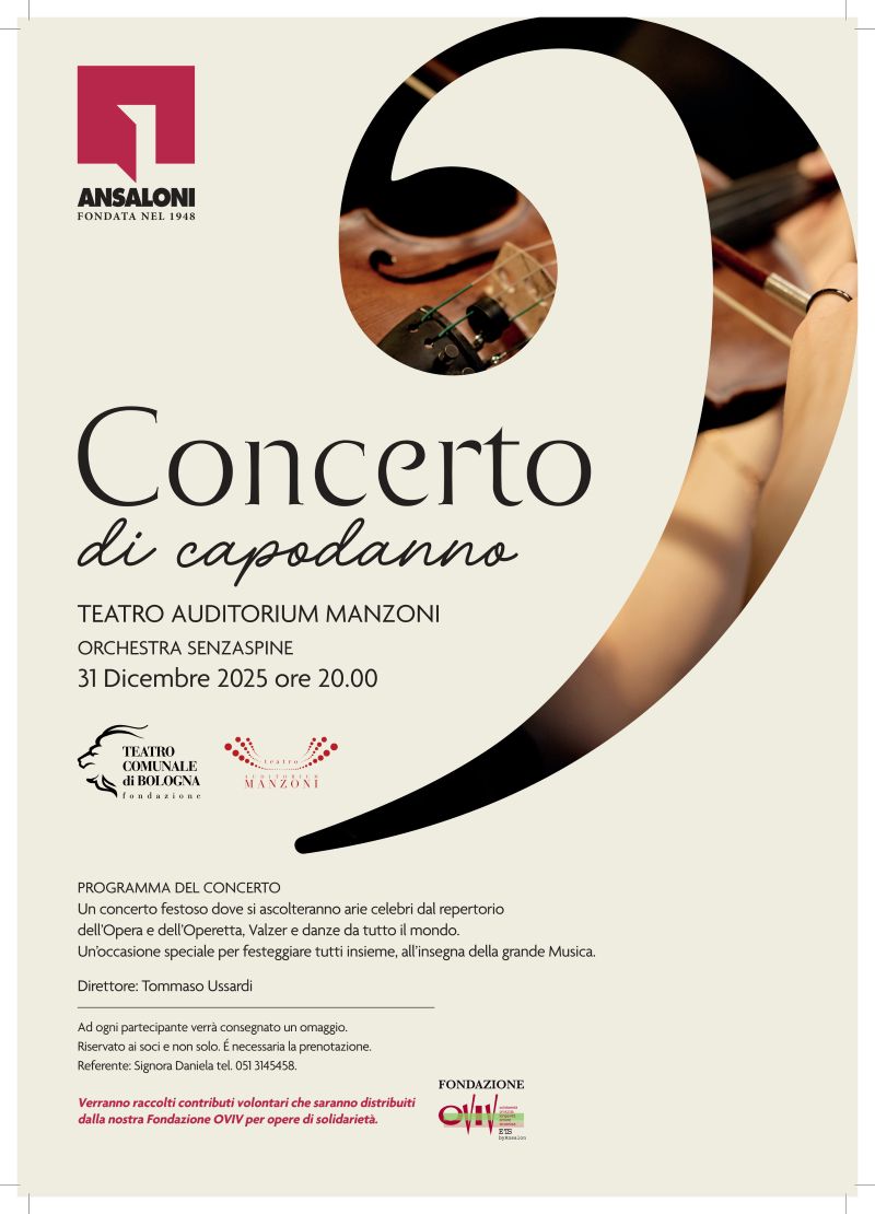 Partecipa al Concerto di Capodanno organizzato da Cooperativa Ansaloni:il 31 dicembre ti aspettiamo per trascorrere insieme una grande serata di musica al Teatro Manzoni. Prenota allo 051-3145458!
