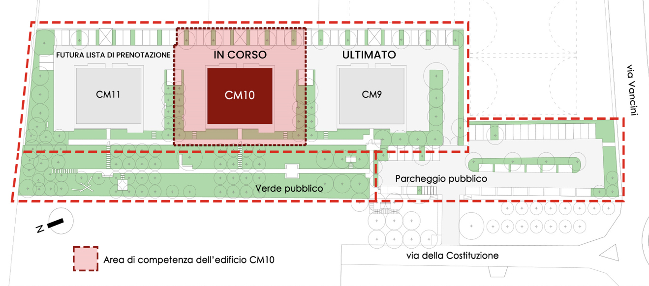 L’immobile è in costruzione all’interno dell’area Campi da tennis, tra via Oreste Vancini e Via Galliera dove è previsto il nostro intervento CM10. L’appartamento sarà parte di una palazzina di 4 piani composta da 15 unità immobiliari, ognuna con garage e posto auto.